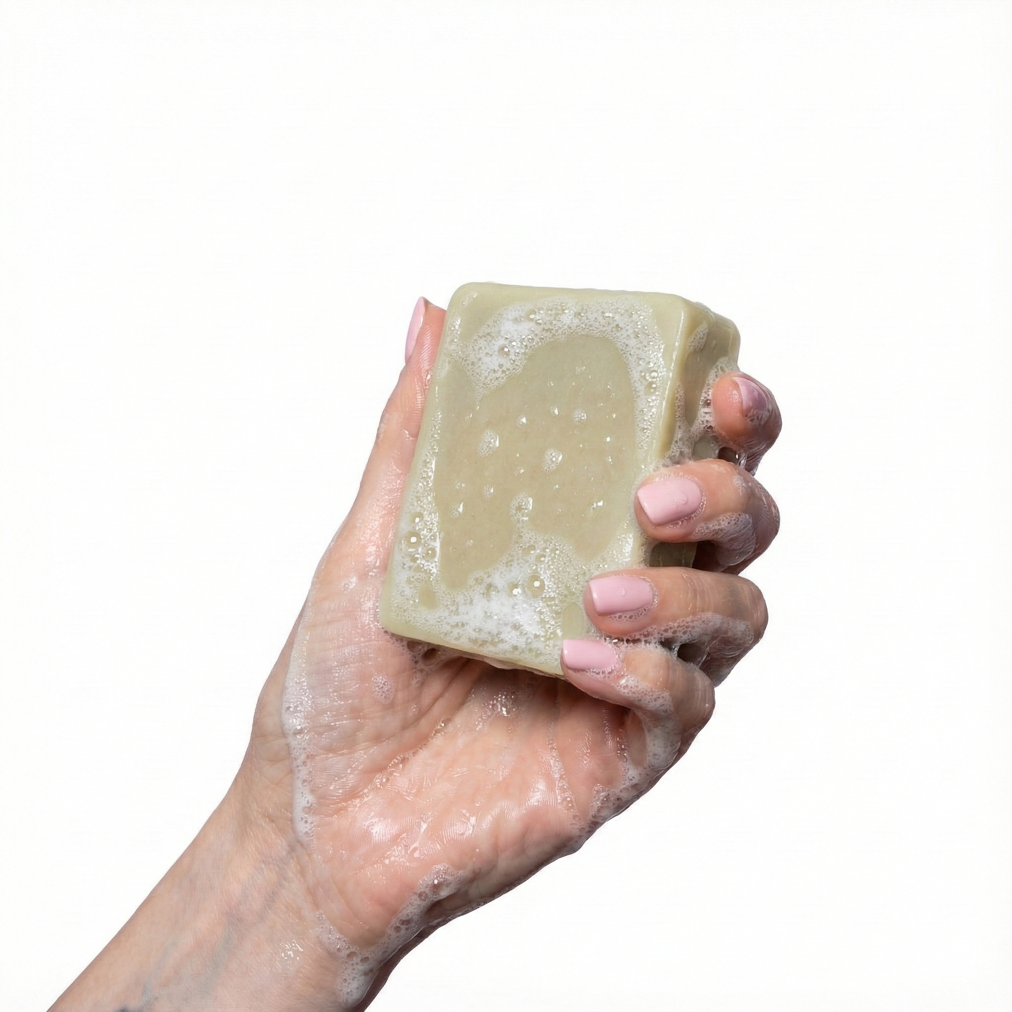 Lather the bar on damp skin and gently massage the foam over the area. Let it sit briefly, then rinse well and pat dry. Follow with a moisturizer or body oil for added hydration.